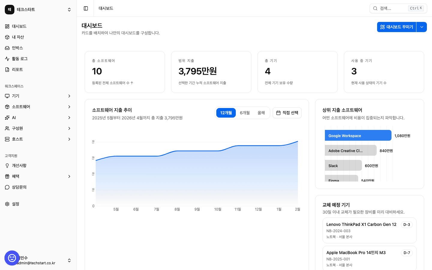 팀의 구독 서비스와 IT 기기를 한눈에 확인할 수 있습니다.