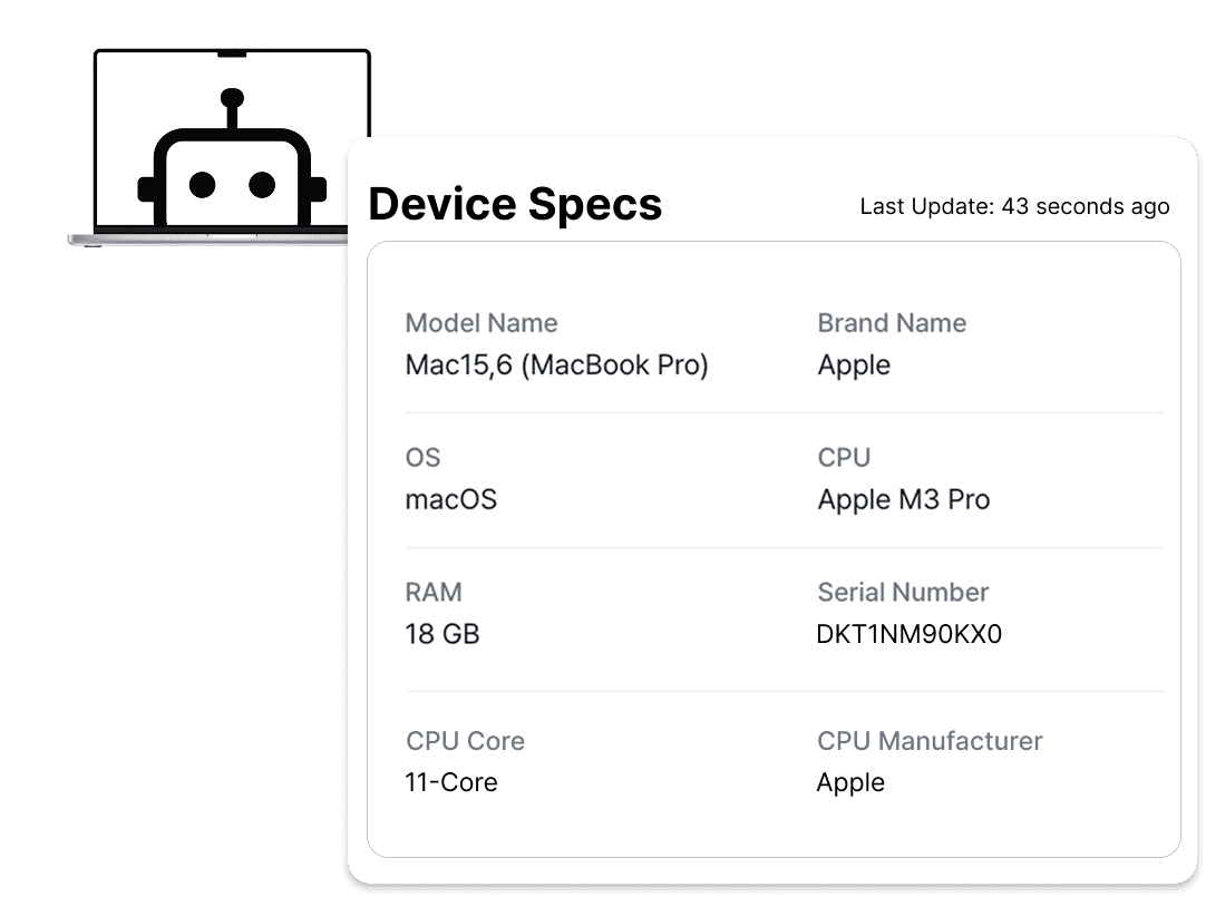 · Automatically gathers device specs, user details, and status.